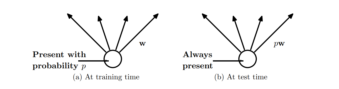 - 테스트 시에는 drop training을 할 때 사용한 p 값을 가중치에 곱해서 사용한다.