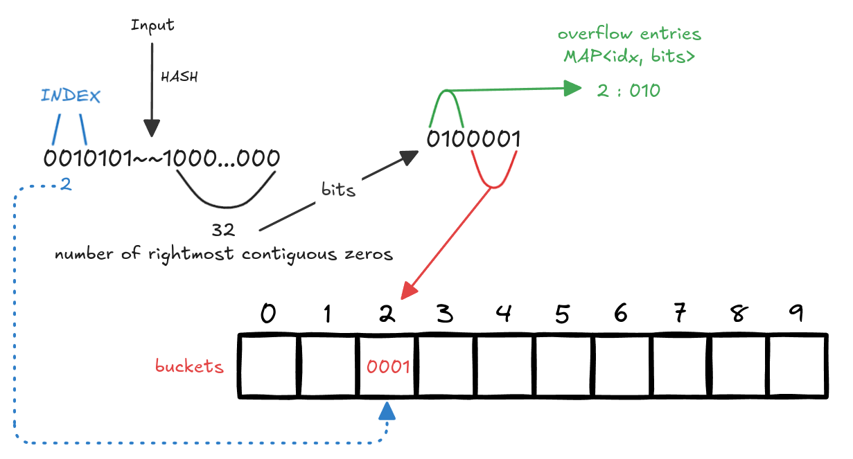 단순히 오른쪽부터 연속된 0의 길이를 구하고, bucket에 저장하면 됐었다. 하지만, presto에서는 bucket 크기에 4비트를 할당했고, 만약 그 이상의 비트를 사용하면 overflow entries에 상위 비트들을 저장한다.