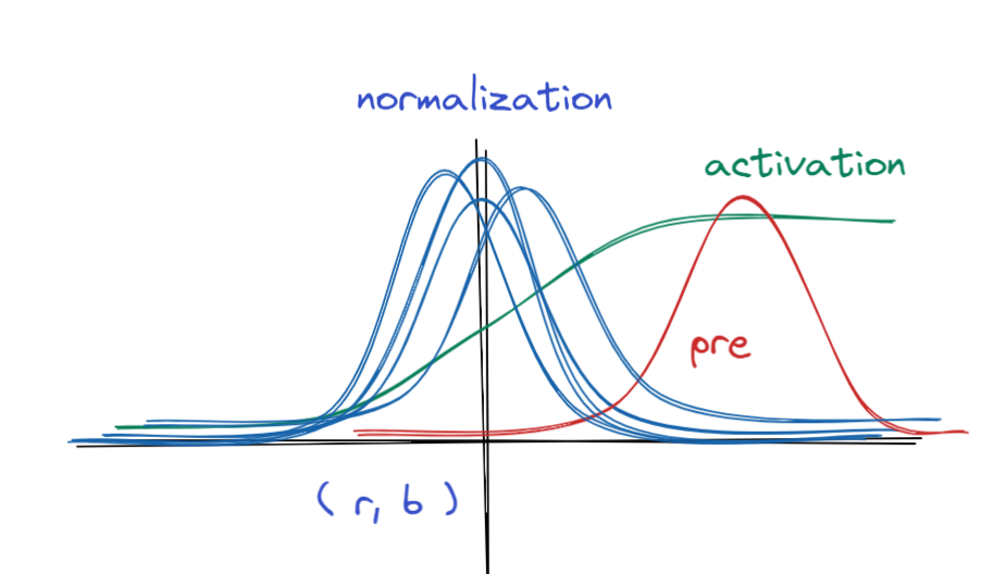 우선 normalization 과정은 빨간 분포를 중앙의 파란 분포로 바꾸는 과정이다.