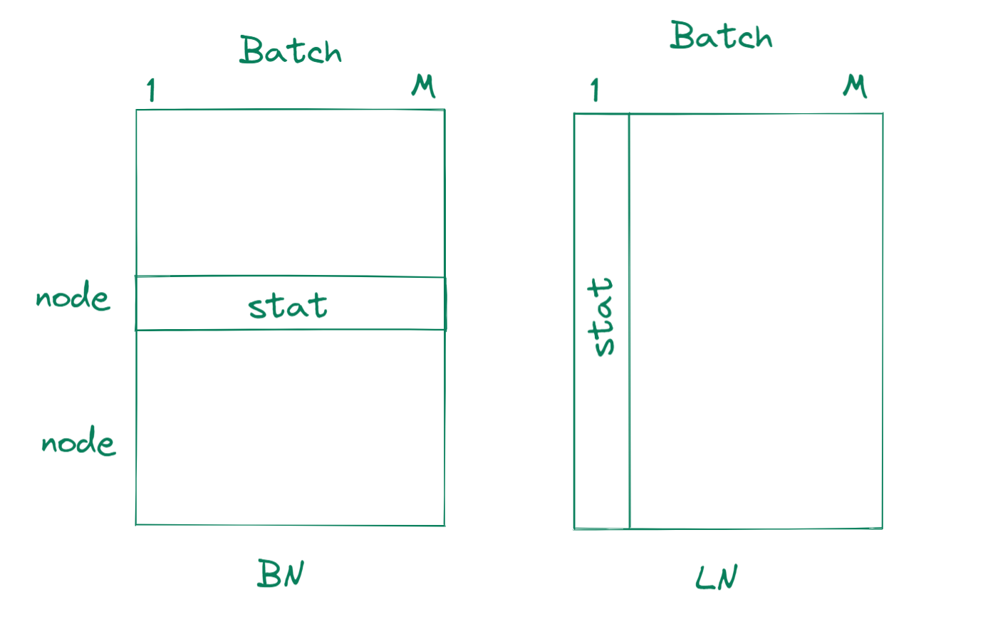 - LN은 한 input에 대하여 작동하며, 같은 층의 노드들의 통계량을 사용한다.
