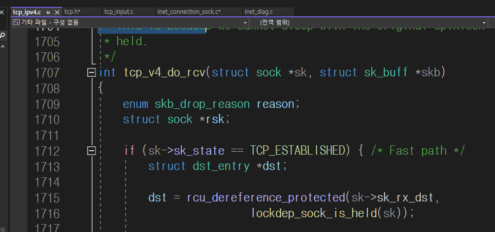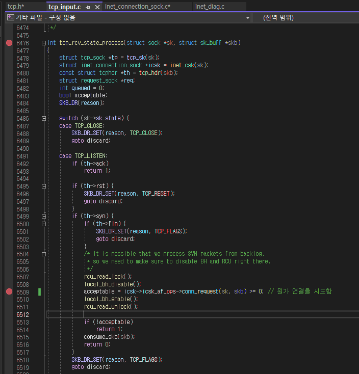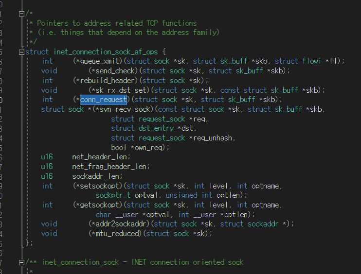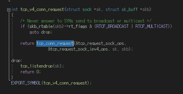 - tcp_v4_conn_request 라는 함수로 맵핑됨 ( tcp_ipv4.c)