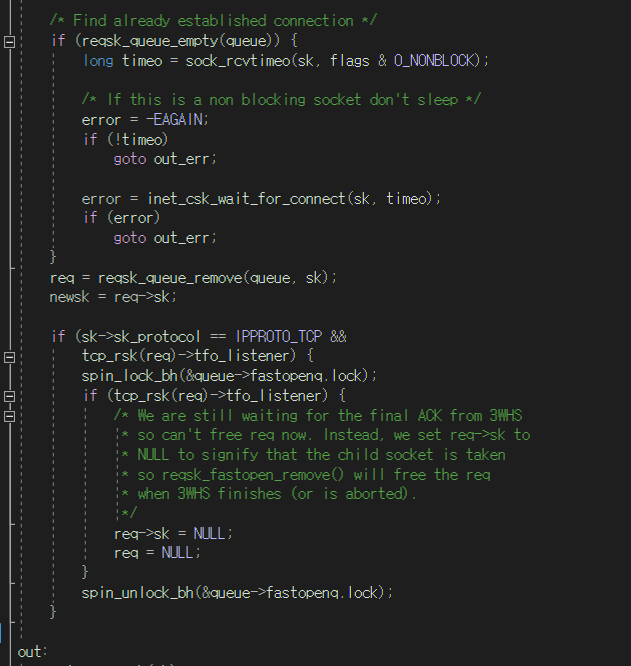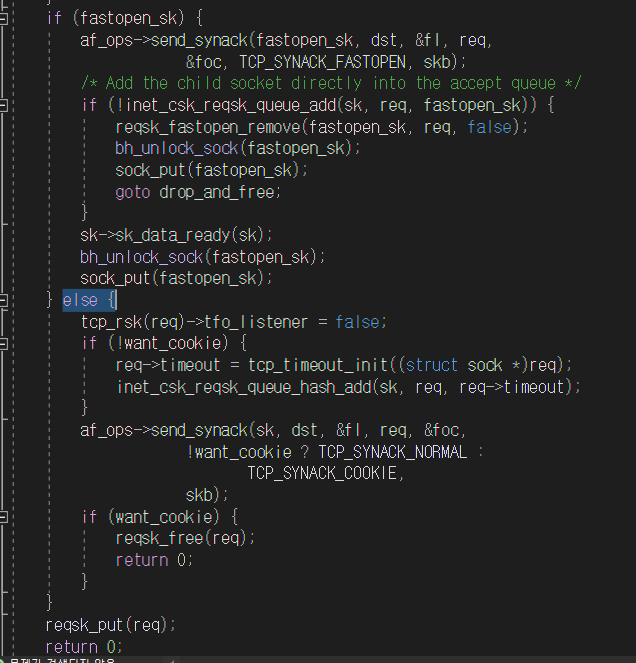 - 다만 tfo 설정이면 null 값으로 만들어 살려주고 reqsk_fastopen_remove가 지우는 것 같다.