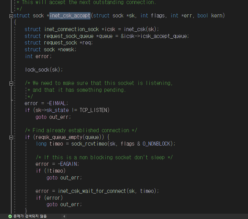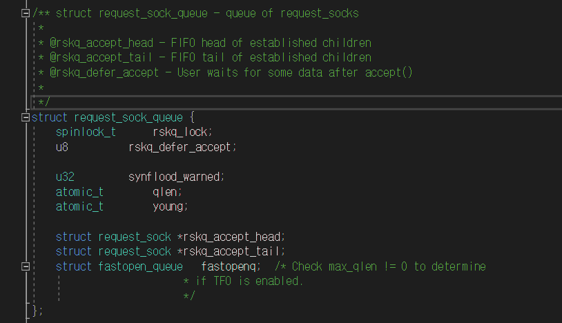 - inet_csk_accept 함수에서 가져오는 큐의 struct 정의 이다.