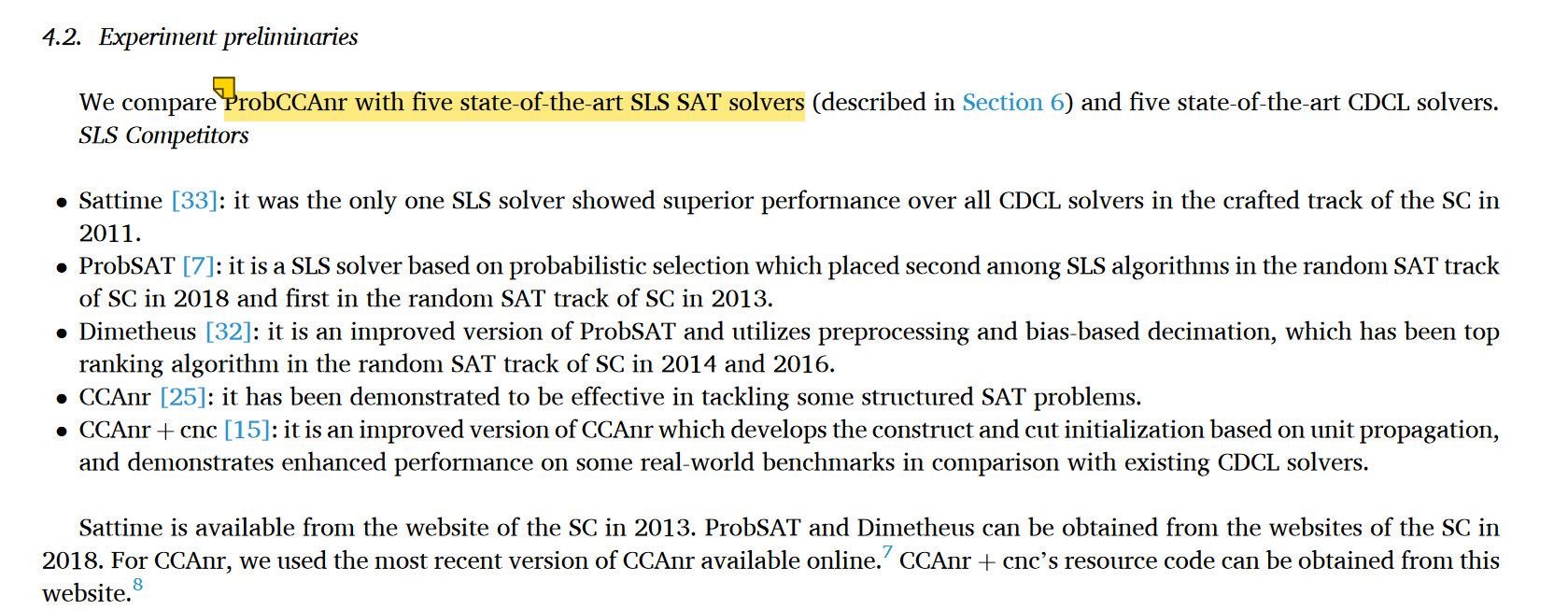 - CCAnr : S . Cai, C. Luo, K. Su, CCAnr: A configuration checking based local search solver for non-random satisfiability. InProceedings of the 18th International Conference on Theory and Applications of Satisfiability Testing–SAT 2015, USA, 2015, 1-8.