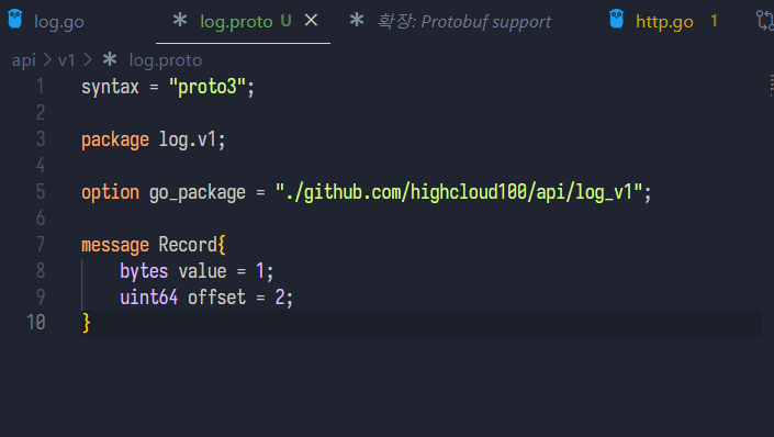 - log.proto 파일을 만들고 다음과 같이 쓴다.