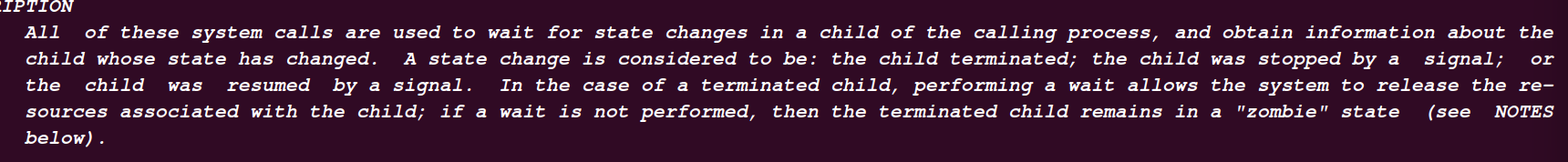 - 부모 프로세스는 wait 시스템 콜을 통해 자식 프로세스의 종료 상태를 읽어 들인다.