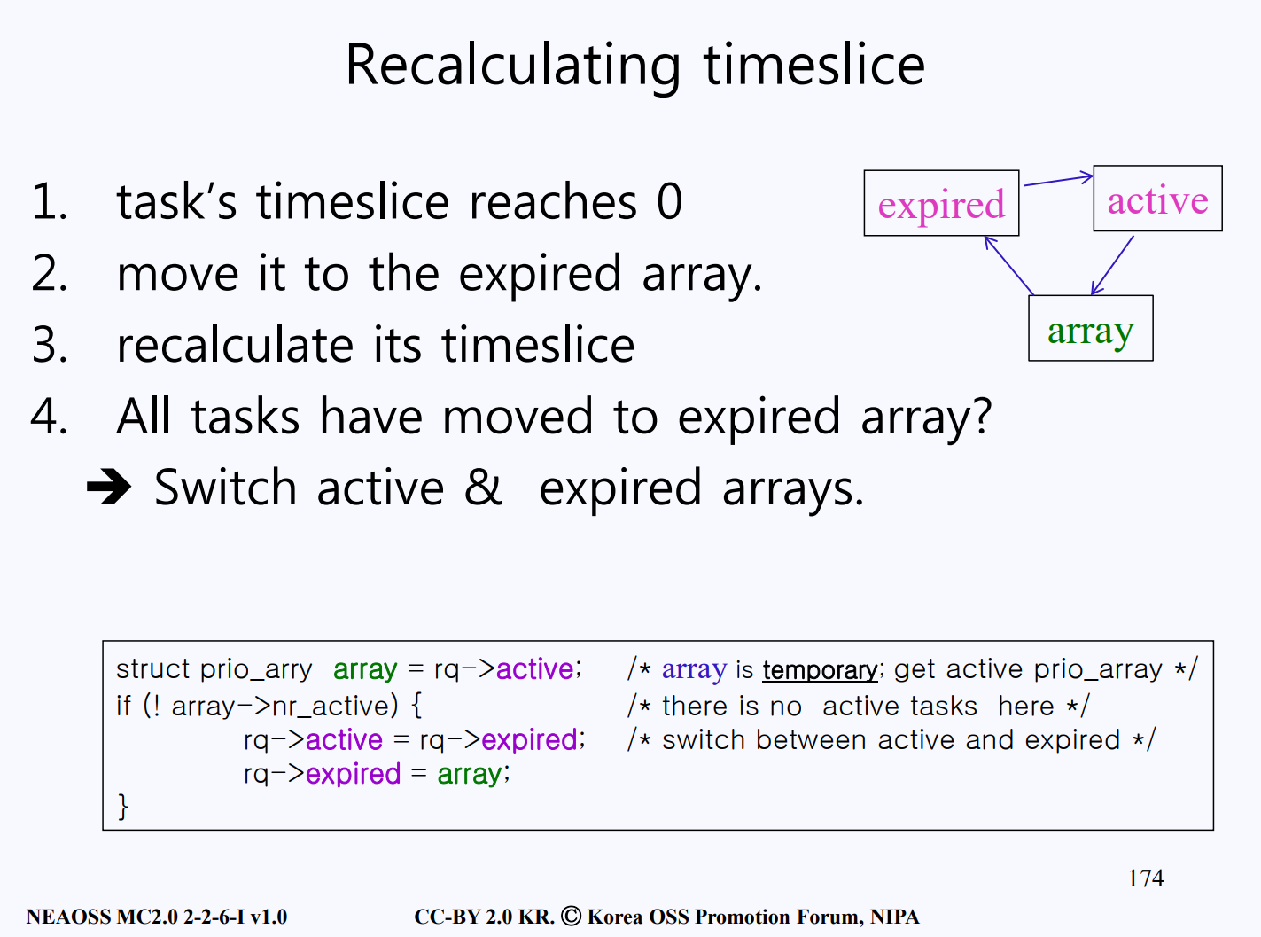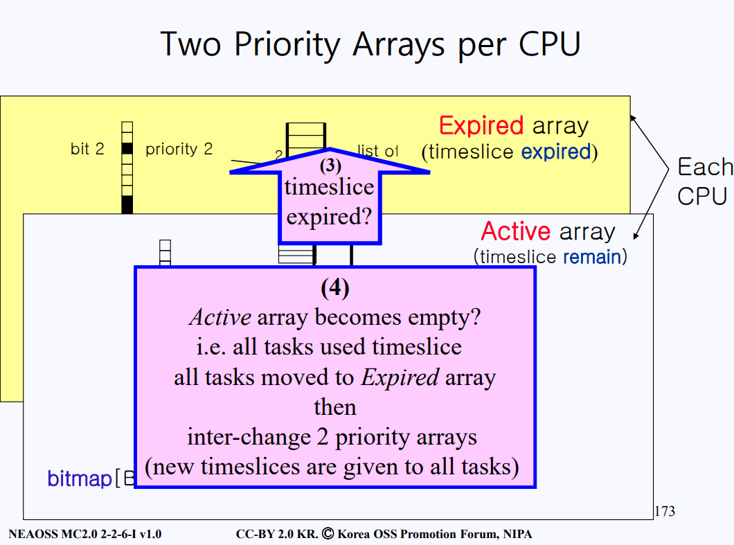- active array가 사용이 다 되면 expired 에 time slice를 배정하고 active array로 바꾼다.