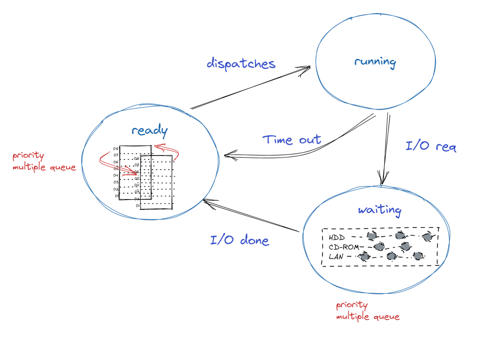- 대기 상태의 프로세스도 큐를 가지고 있다.