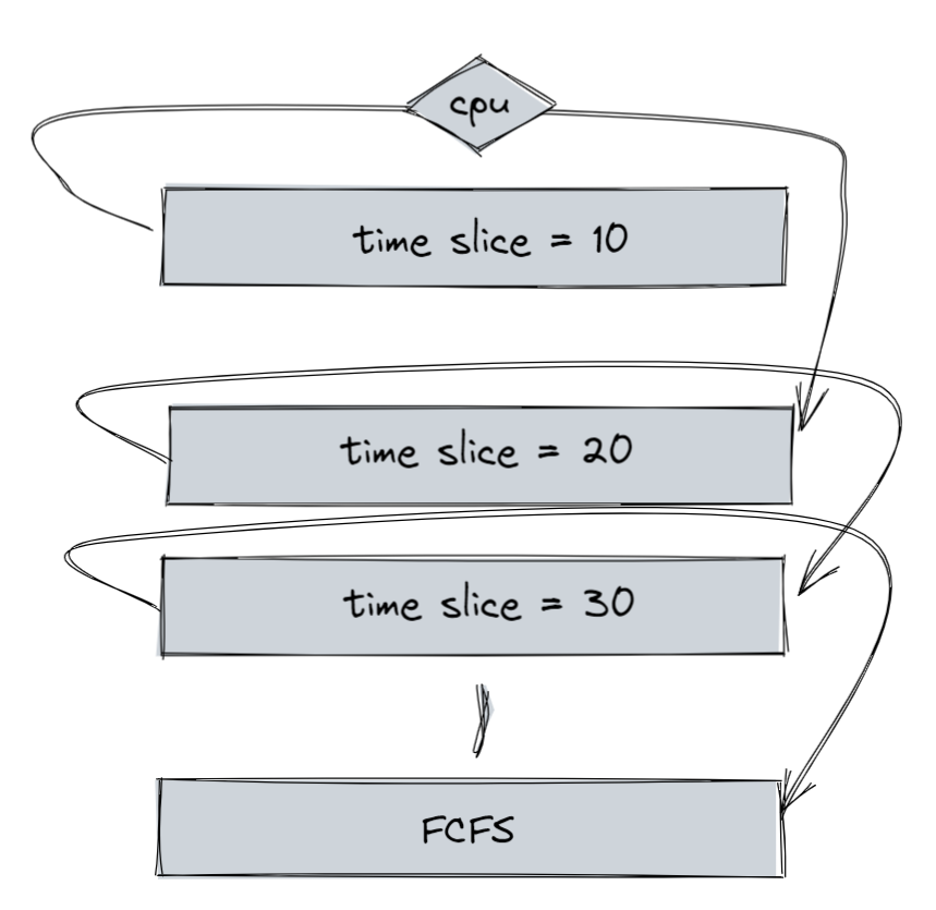 - 마지막 큐의 타임 슬라이스는 무한대의 타임 슬라이스를 가지며 이는 FCFS 로 동작하는 것과 같다.