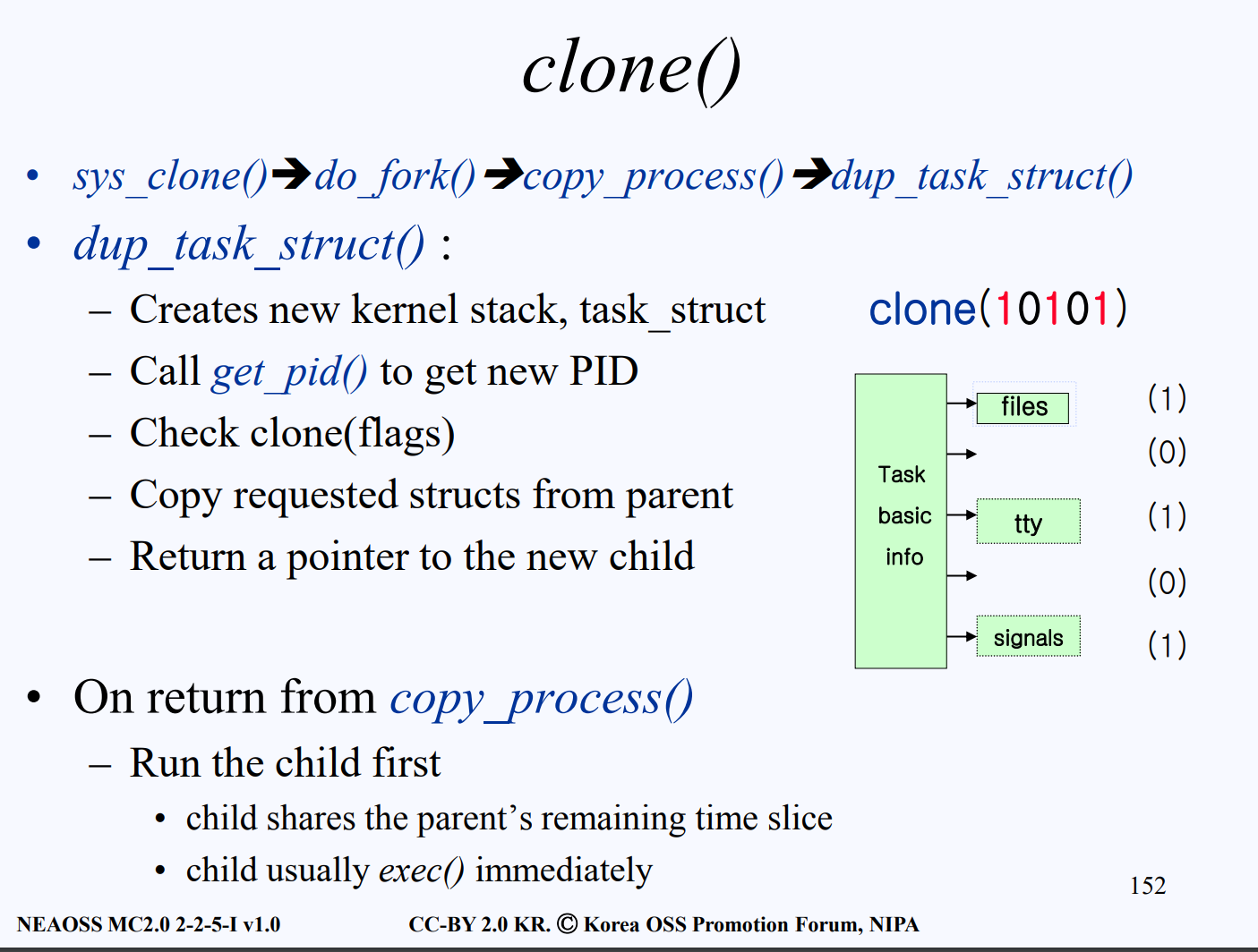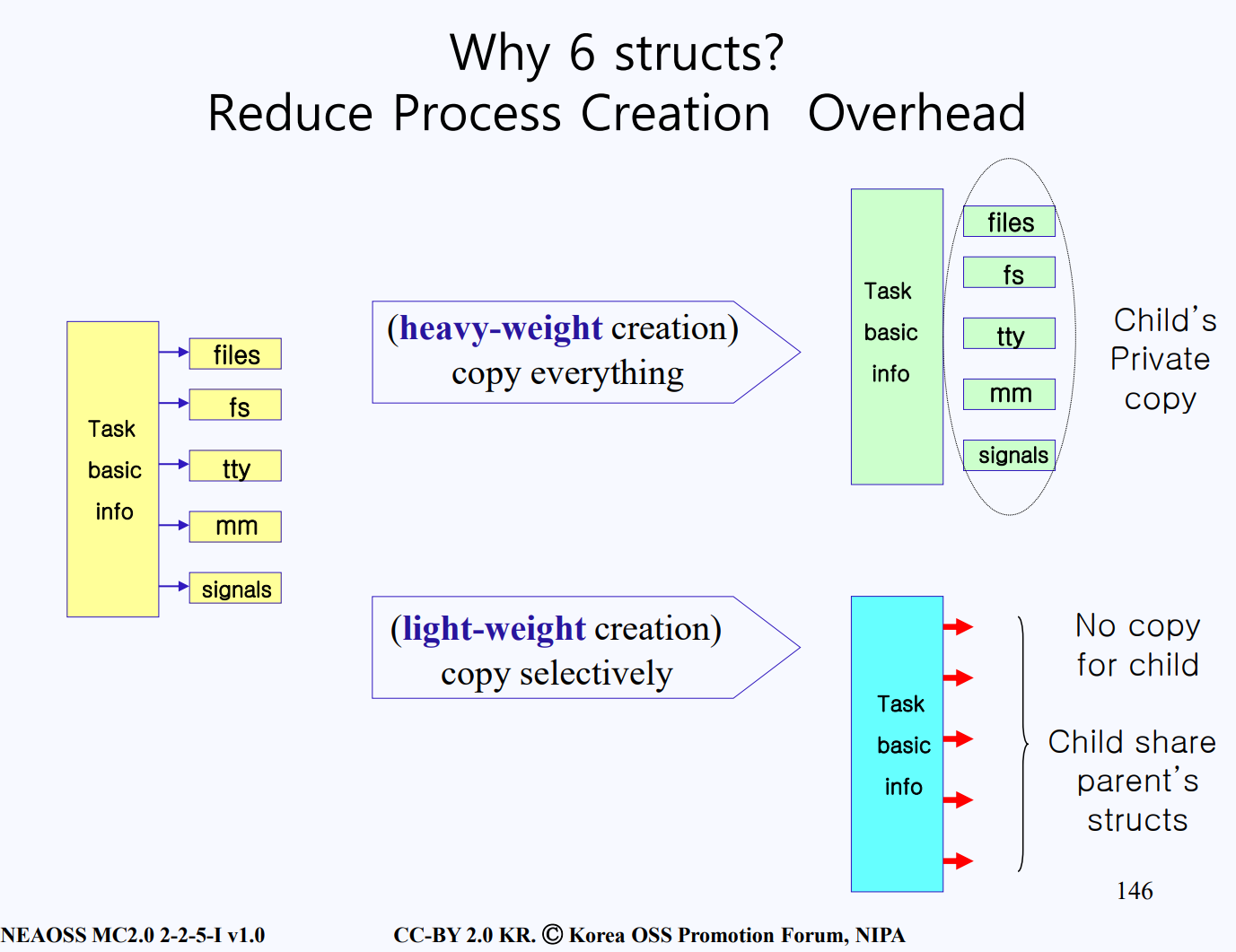 - files, fs, tty, mm, signals 정보는 부모와 다르게 사용되지 않는다.