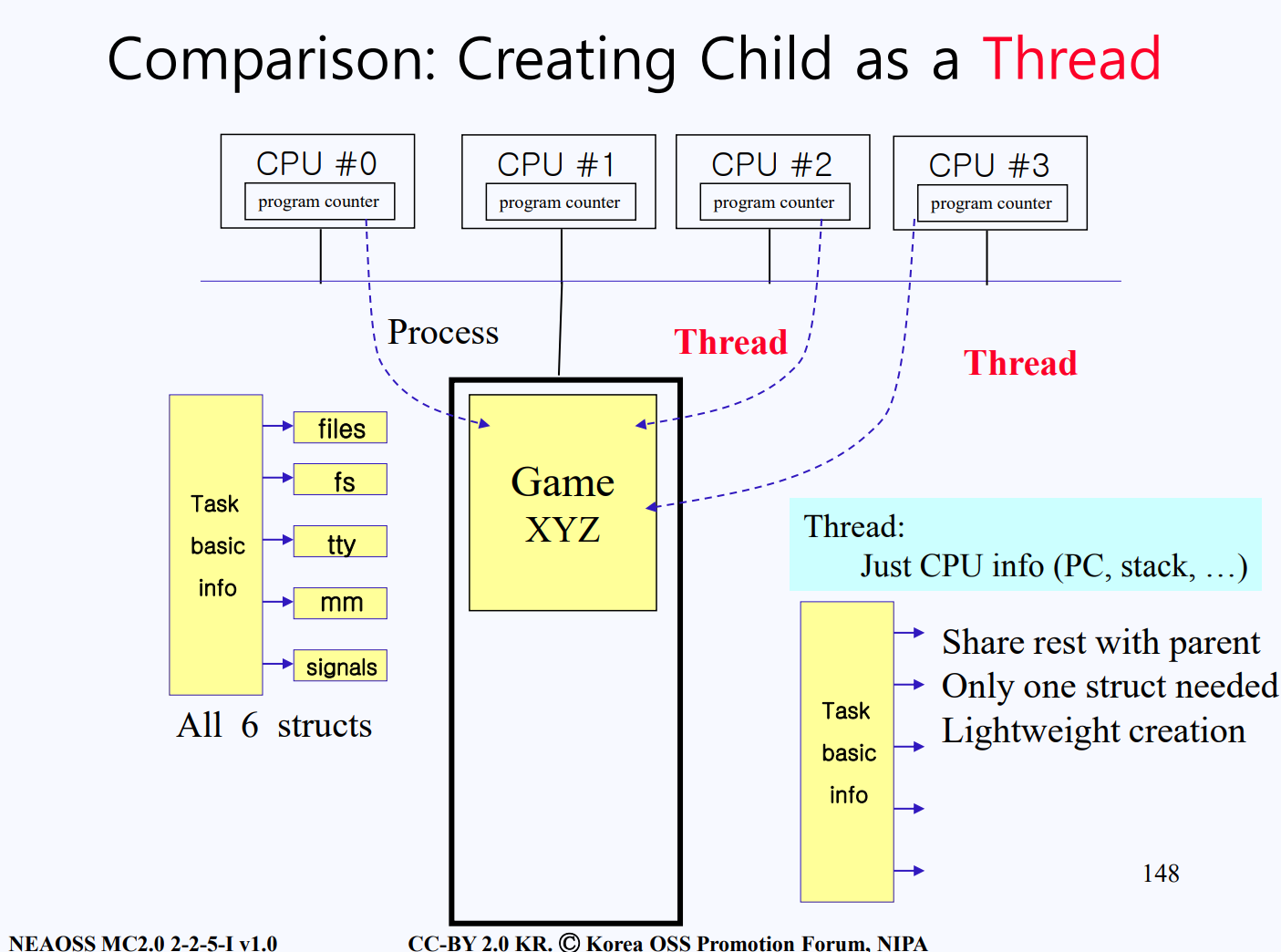 - 프로세스는 운영체제가 설계될 당시 만들어졌지만 쓰레드는 한참 뒤에 만들어진다.