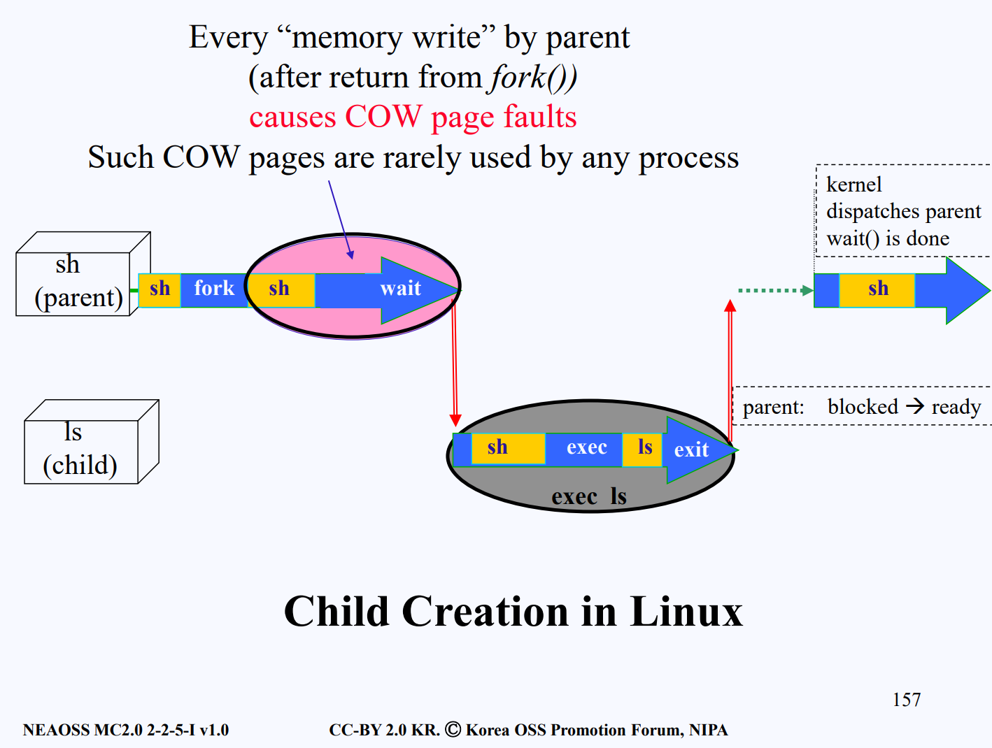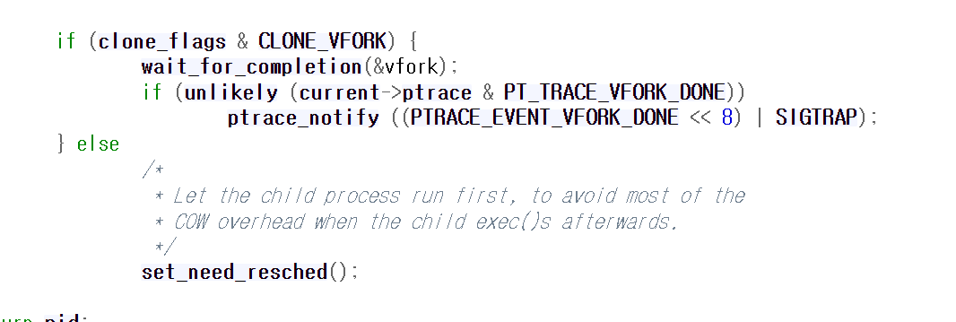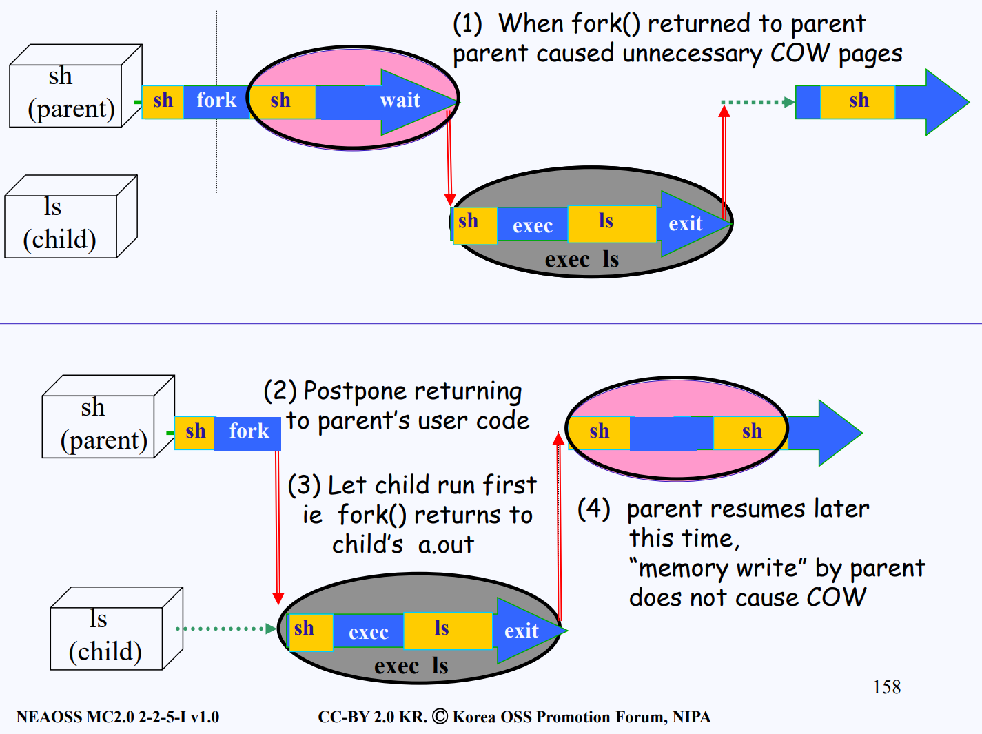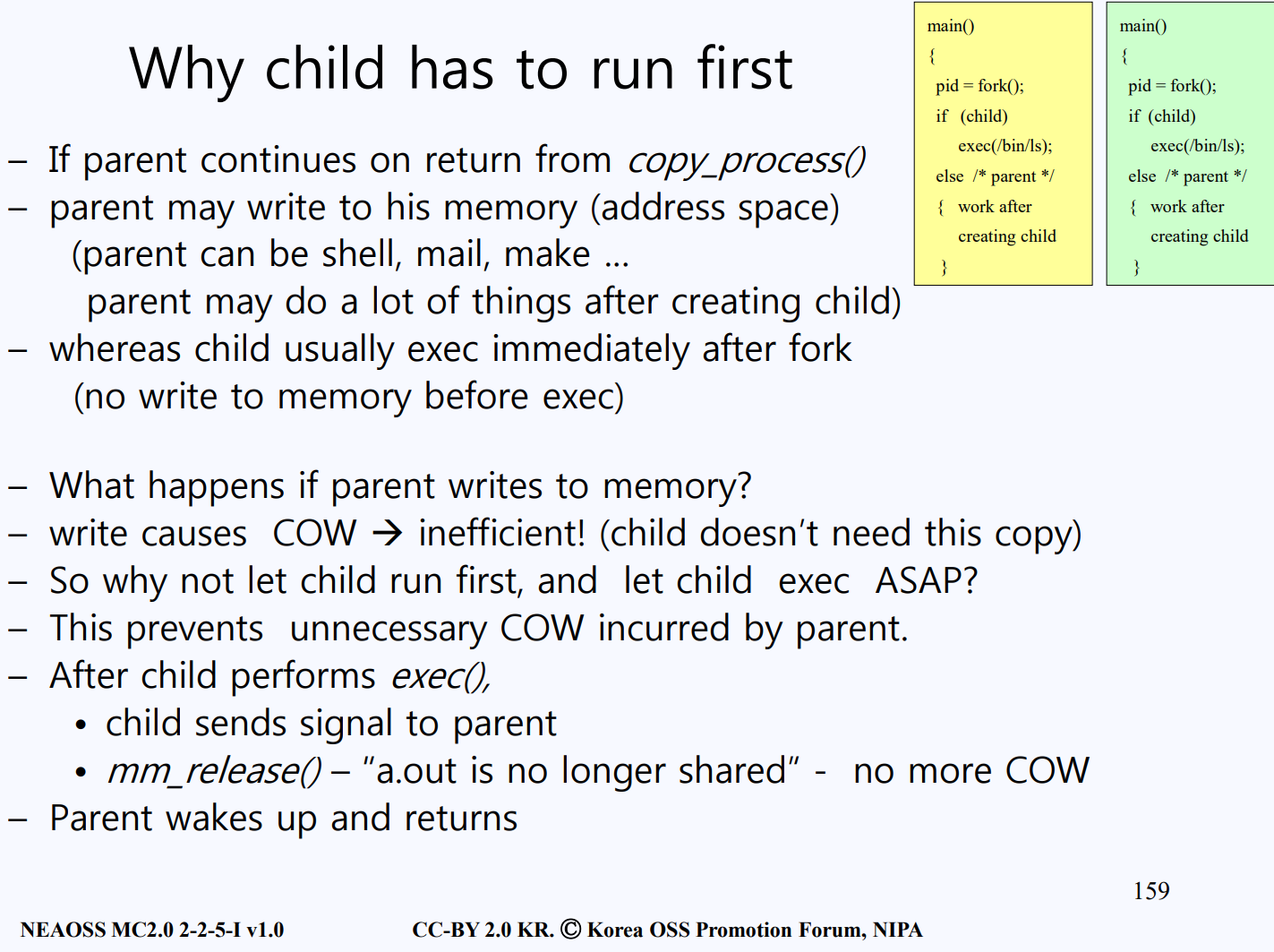 - 그래서 리눅스에서는 이를 해결하기 위해서 fork가 발생하면 바로 cpu를 자식이 먼저 실행되도록 넘겨버린다.